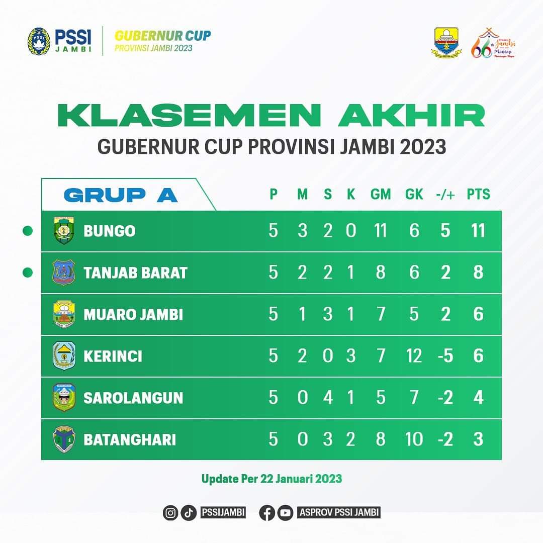 Berikut klasemen akhir penyisihan grup Gubernur Cup 2023.