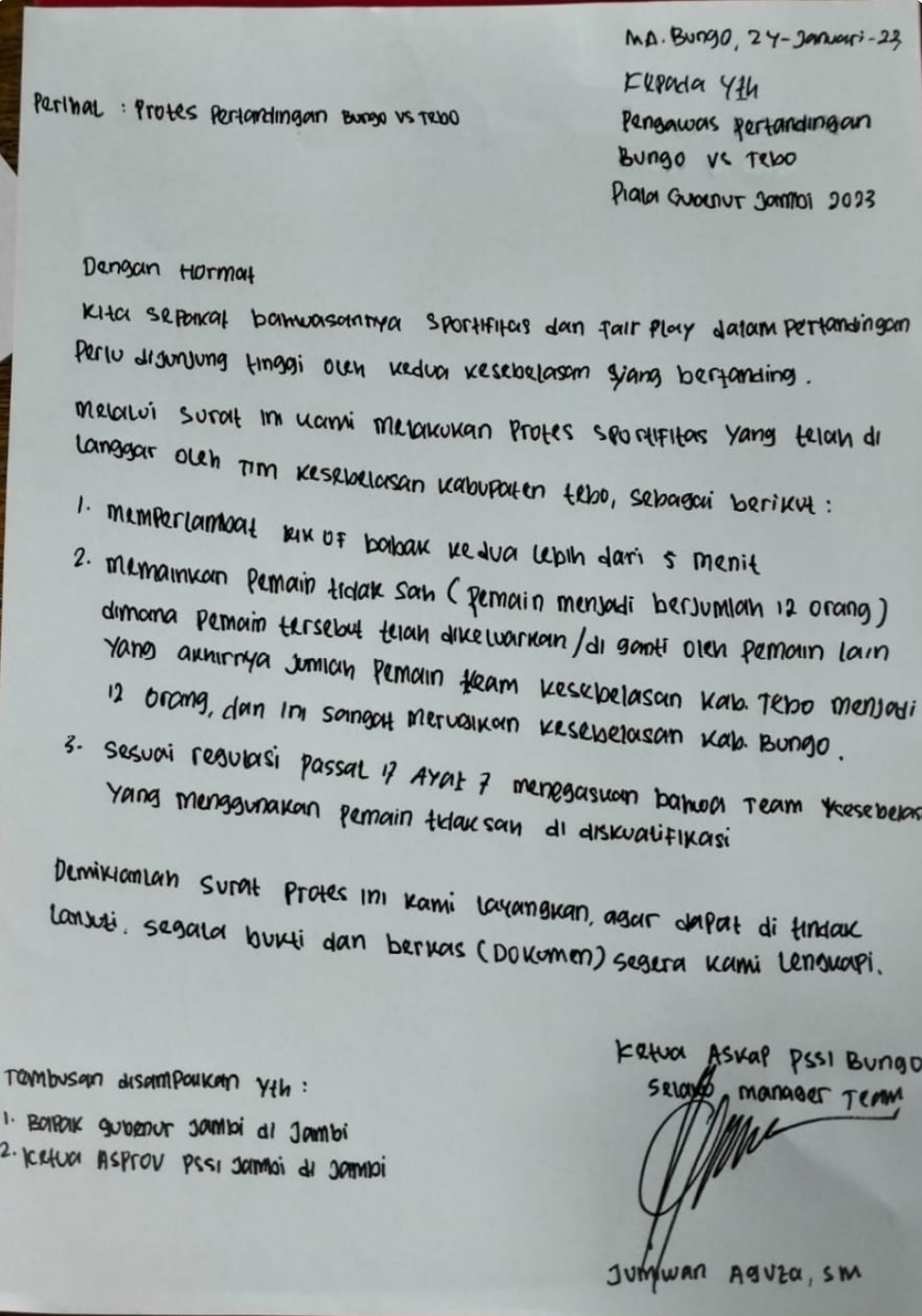 Terkait itu, tim Bungo melayangkan protes terhadap pertandingan vs Tebo tersebut. Berikut isi protes yang dilakukan ASKAB PSSI Bungo terkait sportivitas yang telah dilanggar oleh tim kesebelasan Kabupaten Tebo: