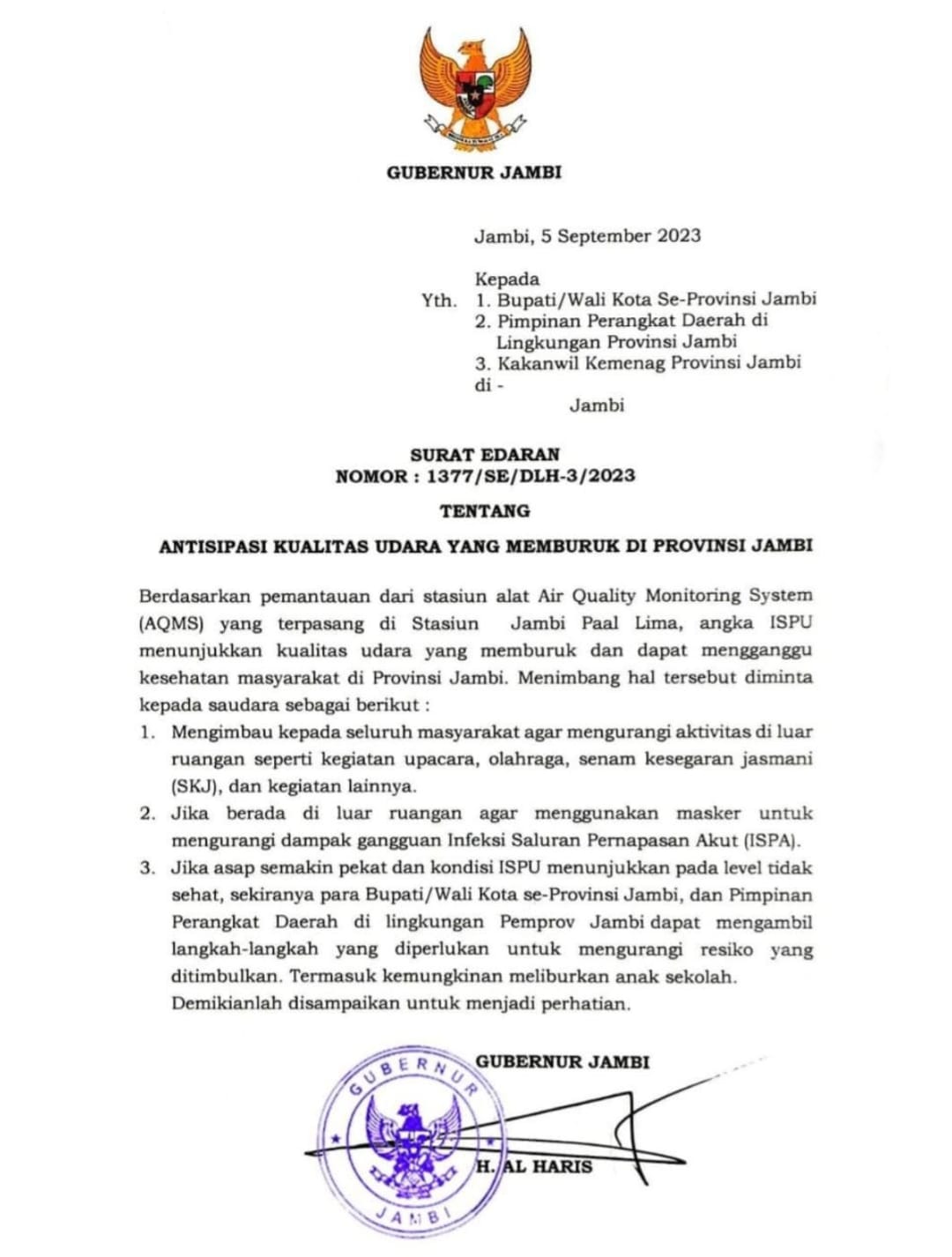 Berikut surat edaran Gubernur Jambi tentang antisipasi kualitas udara yang memburuk di Provinsi Jambi.