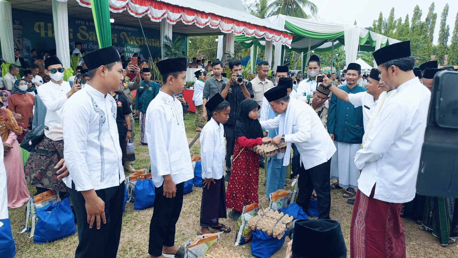 Pada peringatan hari santri nasional di Rimbo Bujang, Kabupaten Tebo ini Gubernur Jambi Al Haris bersama Ketua DPRD Provinsi Jambi, dan Pj Bupati Tebo memberikan sembako kepada anak yatim dan Lansia.(rky)