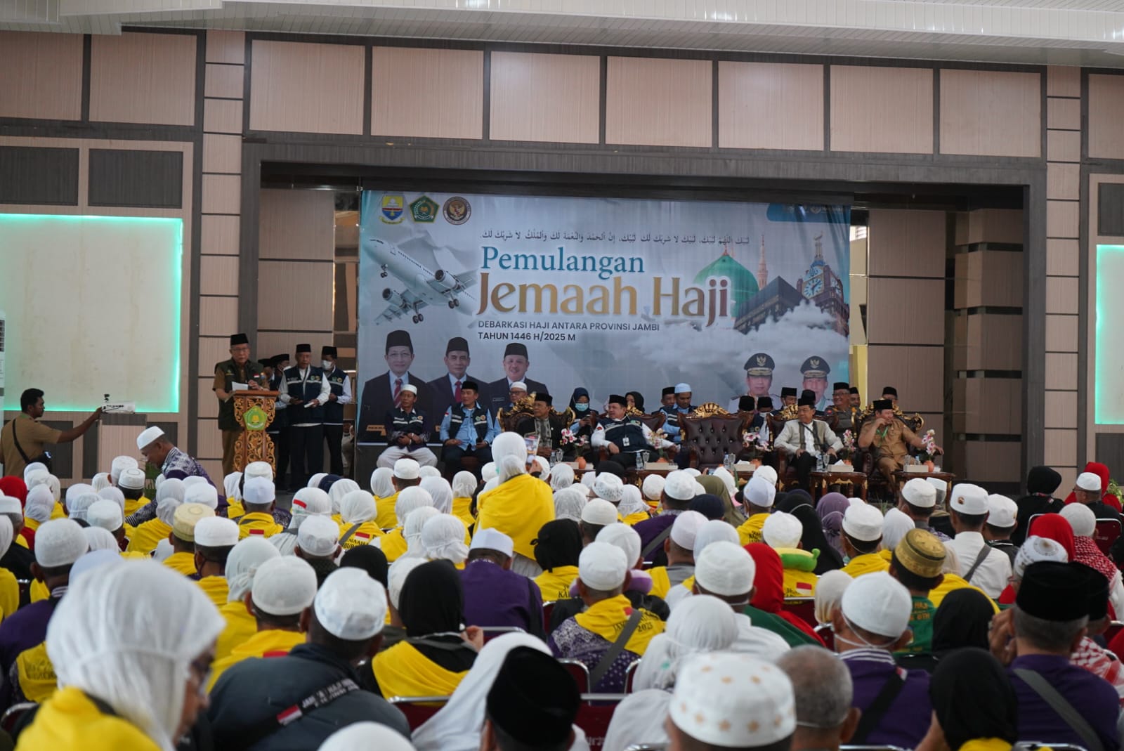 “Alhamdulillahi Robbil’alamiin, atas nama masyarakat dan Pemerintah Provinsi Jambi, saya ucapkan selamat datang kembali di tanah air bagi para dhuyufurrahman (tamu-tamu Allah). Semoga para jemaah beserta seluruh Pemandu Haji Daerah (PHD)/Kelompok Bimbingan Ibadah Haji dan Umroh (KBIHU) dan Panitia Penyelenggara Ibadah Haji (PPIH) dalam keadaan sehat wal’afiat dan insya Allah menjadi haji yang mabrur,” ujar Wagub Sani.