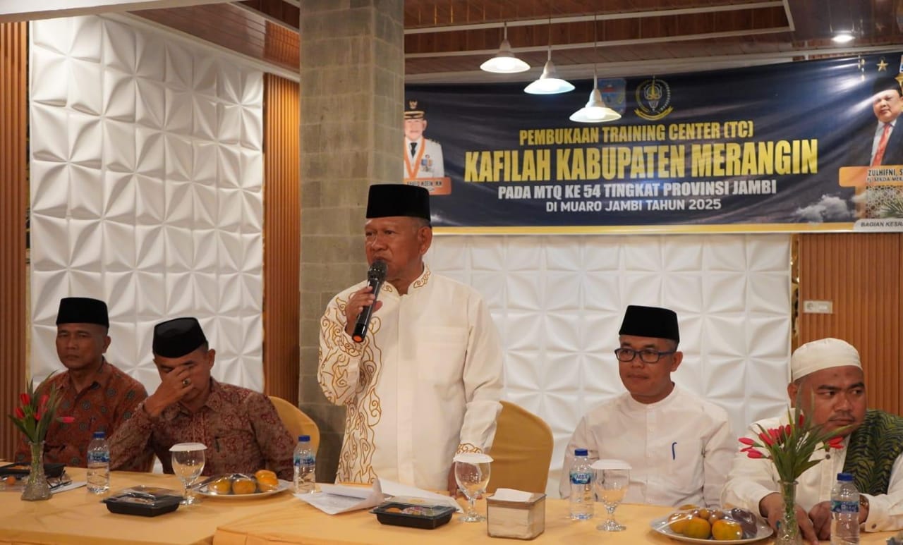 Bangko – Wabup Merangin A Khafidh membuka Training Center (TC) yang diikuti sebanyak 56 orang Khafilah Merangin, untuk mengikuti Musabaqoh Tilawatil Quran (MTQ) ke-54, tingkat Provinsi Jambi di Kabupaten Muarojambi, Minggu malam (28/09/2025).