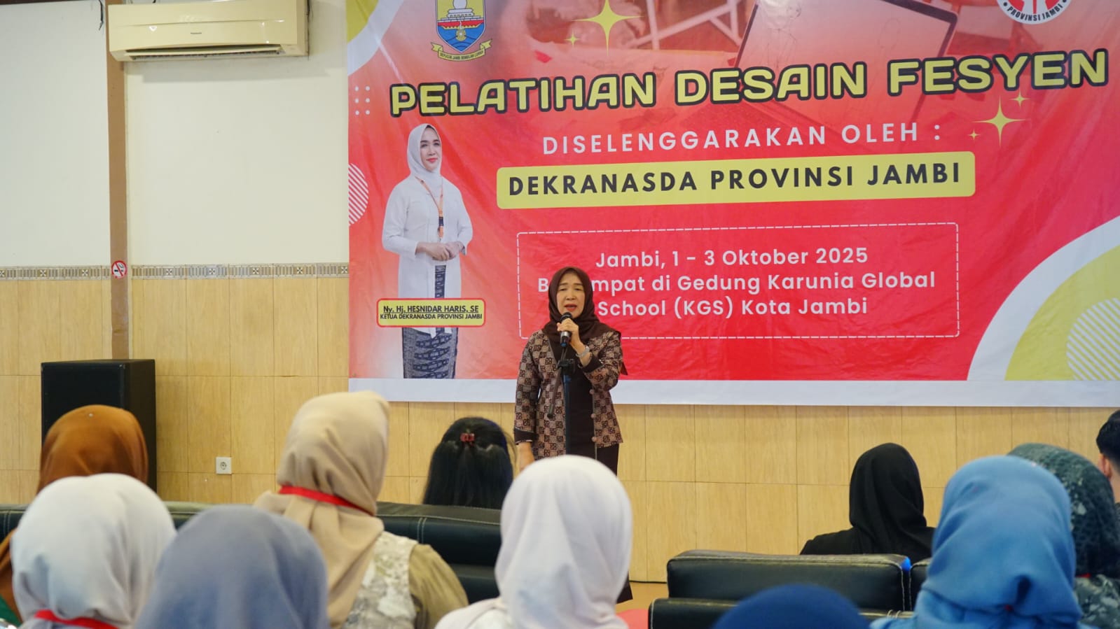 Jambi – Ketua Dewan Kerajinan Nasional Daerah (Dekranasda) Provinsi Jambi, Hesnidar Haris (Hesti Haris) menghadiri sekaligus membuka Pelatihan Desain Fesyen yang diselenggarakan oleh Dekranasda Provinsi Jambi di Gedung Karunia Global School, Kota Jambi, Rabu (01/10/2025) pagi.