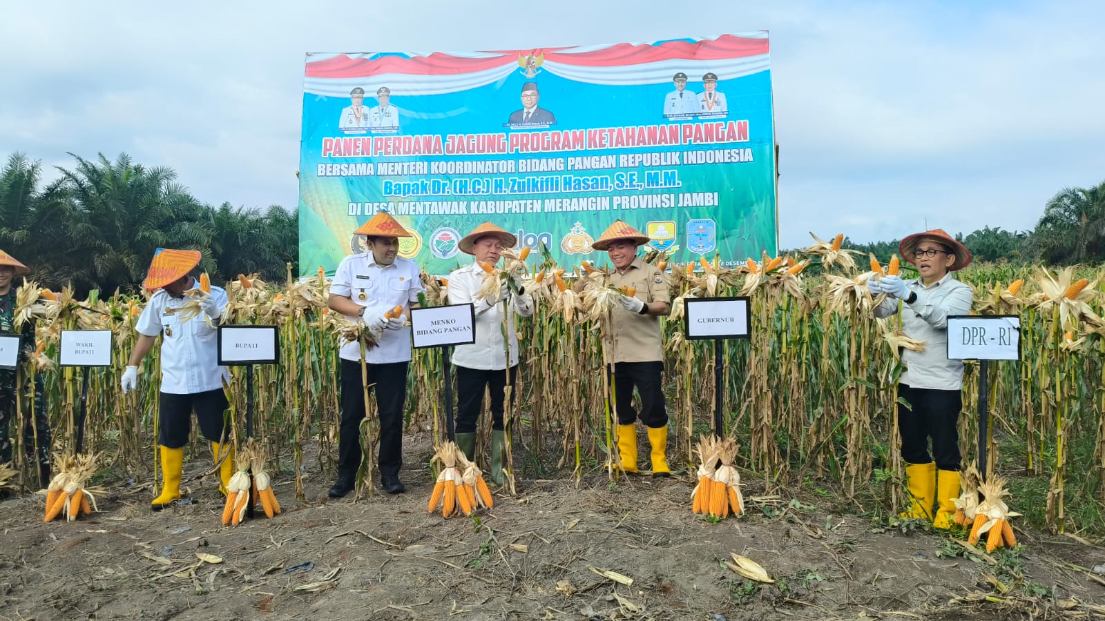 Panen jagung tersebut turut dihadiri anggota DPR RI A. Bakrie, Gubernur Jambi Al Haris, Bupati Merangin M. Syukur, Wakil Bupati Merangin Khafid, serta jajaran TNI, Polri, dan para petani setempat.